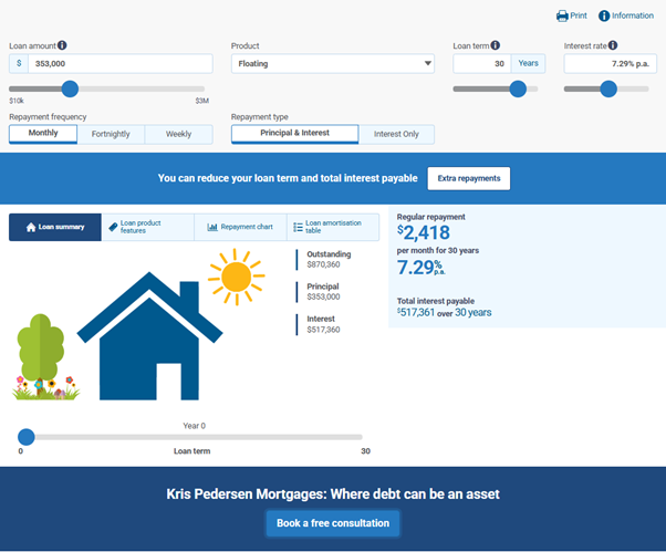 By jumping onto our mortgage calculator at https://www.krispedersen.co.nz/calculator/ and putting in an interest rate of 7.29% (1% more than the interest rate being charged) and then playing around with the loan amount, it can be seen that the maximum loan amount is circa $353k.