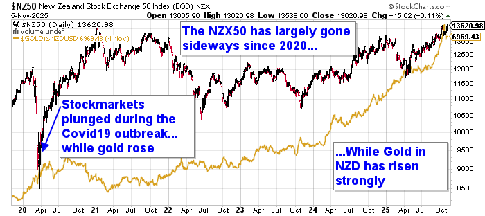 Many New Zealand investors have portfolios heavily weighted toward residential property and shares. Precious metals are what's called "non-correlated assets," meaning they often move independently from these traditional investments. When property or share markets struggle, gold and silver can provide stability, smoothing out your overall portfolio performance. Have a look at the graph below which shows how gold has fared in comparison to shares over the last five years.